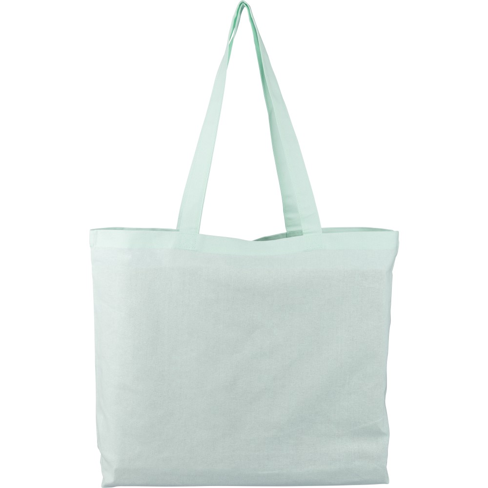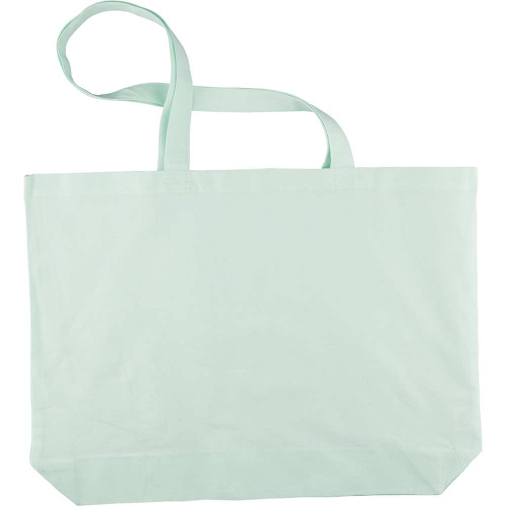 Oeko-Tex minősítésű, 140 g/m2 pamutból készült bevásárlótáska 10 cm-es talppal és 70 cm hosszúságú, 2,5 cm szélességű hosszú fülekkel. Pasztell színekben elérhető: PMS 9562U (zöld), 162U (narancs), 317U (kék) és 522U (lila). Oeko-Tex címkével ellátva.