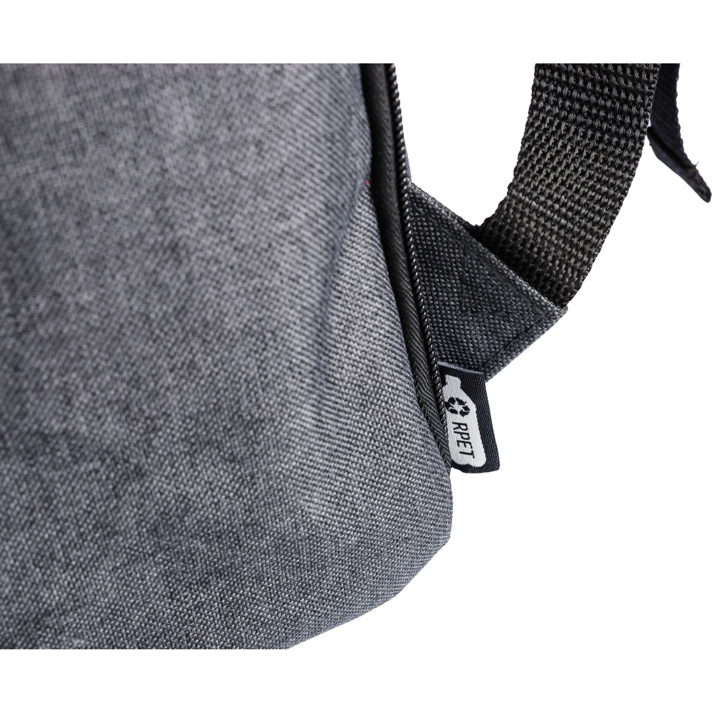 Laptophátizsák 15"-es laptop számára, PVC részletekkel és 210D béléssel. Kis cipzáras elülső zsebbel rendelkezik, benne egy kulcsokhoz rögzíthető karabinerrel, egy cipzáras oldalzsebbel, egy normál oldalzsebbel, valamint egy nagy, mágneszáras rekesszel, amely laptopzsebet tartalmaz. Oldalt nyomógombokkal zárható, ha nincs teljesen megtöltve. Állítható, szellőző pántokkal. Az elülső részen rPET anyagra utaló címke található. Anyaga: 600D poliészter vászon.