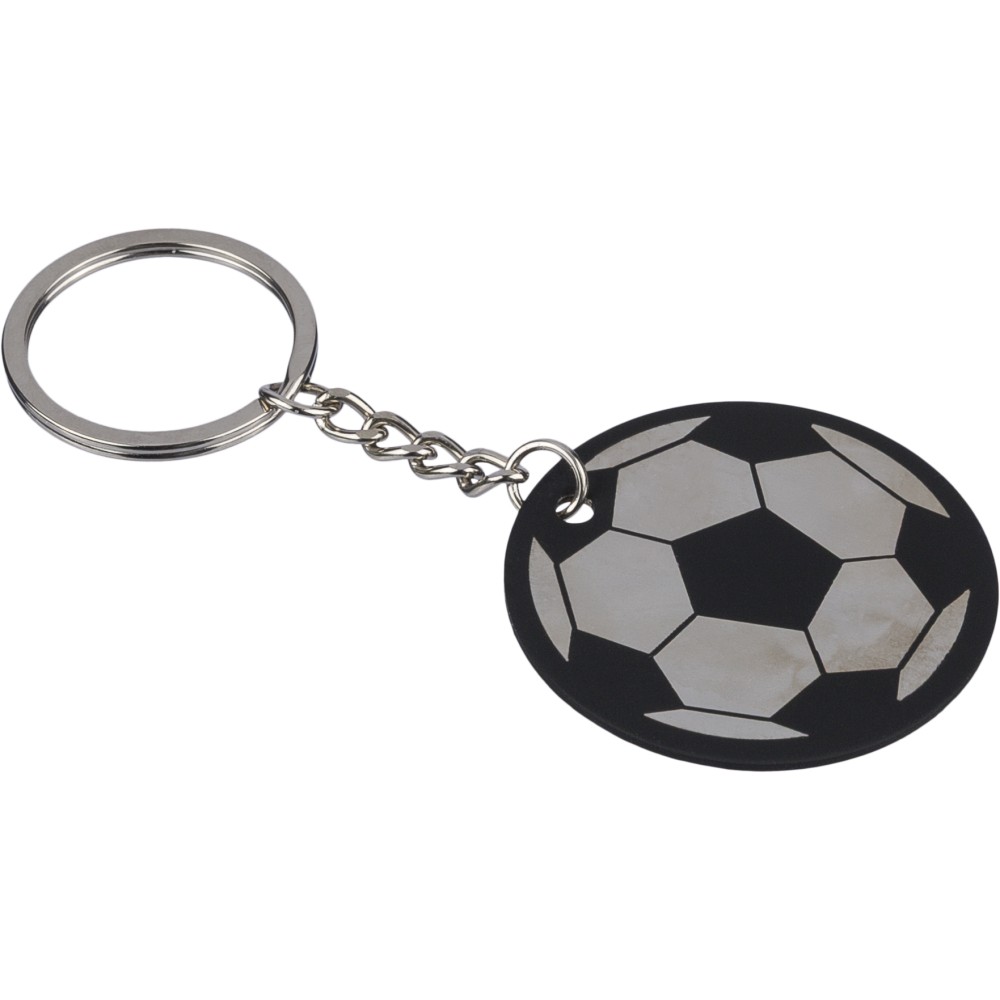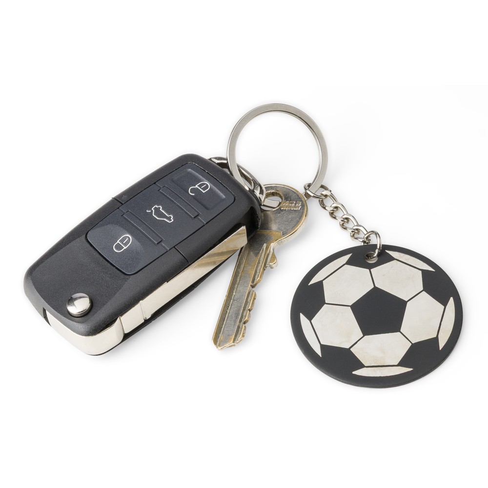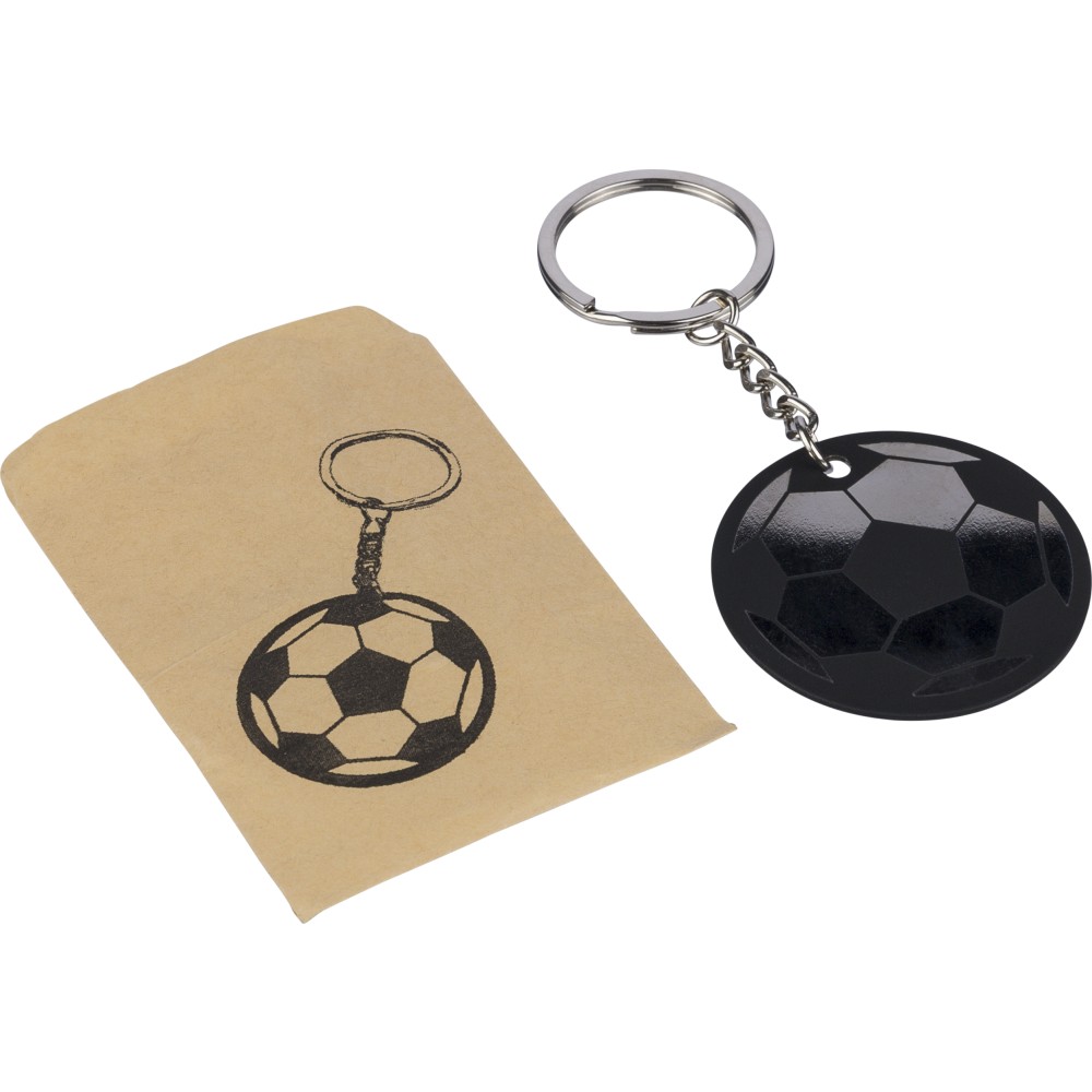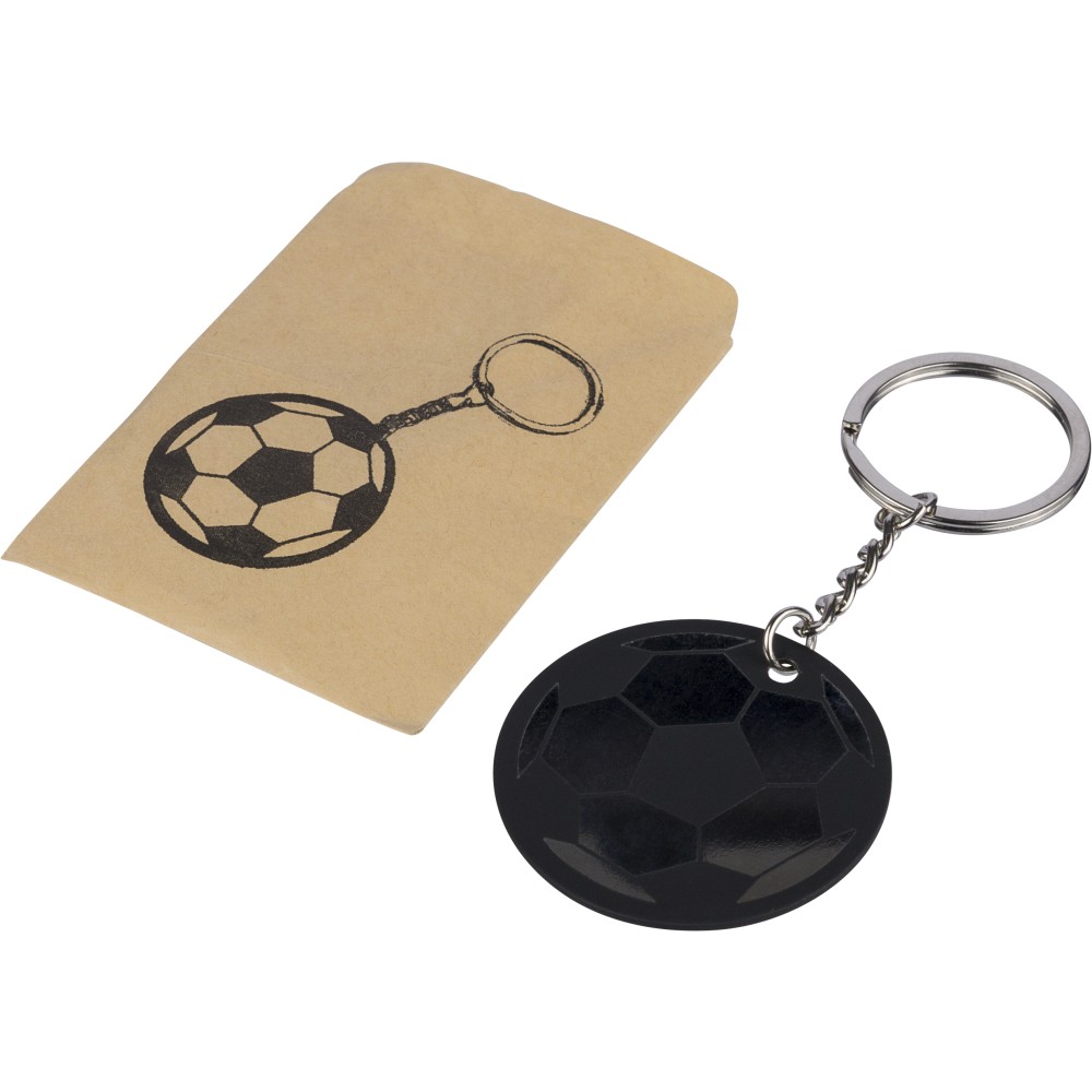 Újrahasznosított rozsdamentes acélból készült, gumírozott felületű focis kulcstartó fém karikával. A kulcstartón gravírozott recycled (újrahasznosított) alapanyagra utaló logó található, amely gravírozás után fényes, tükörszerű hatást mutat. Egyenként kraft papírtasakba csomagolva.