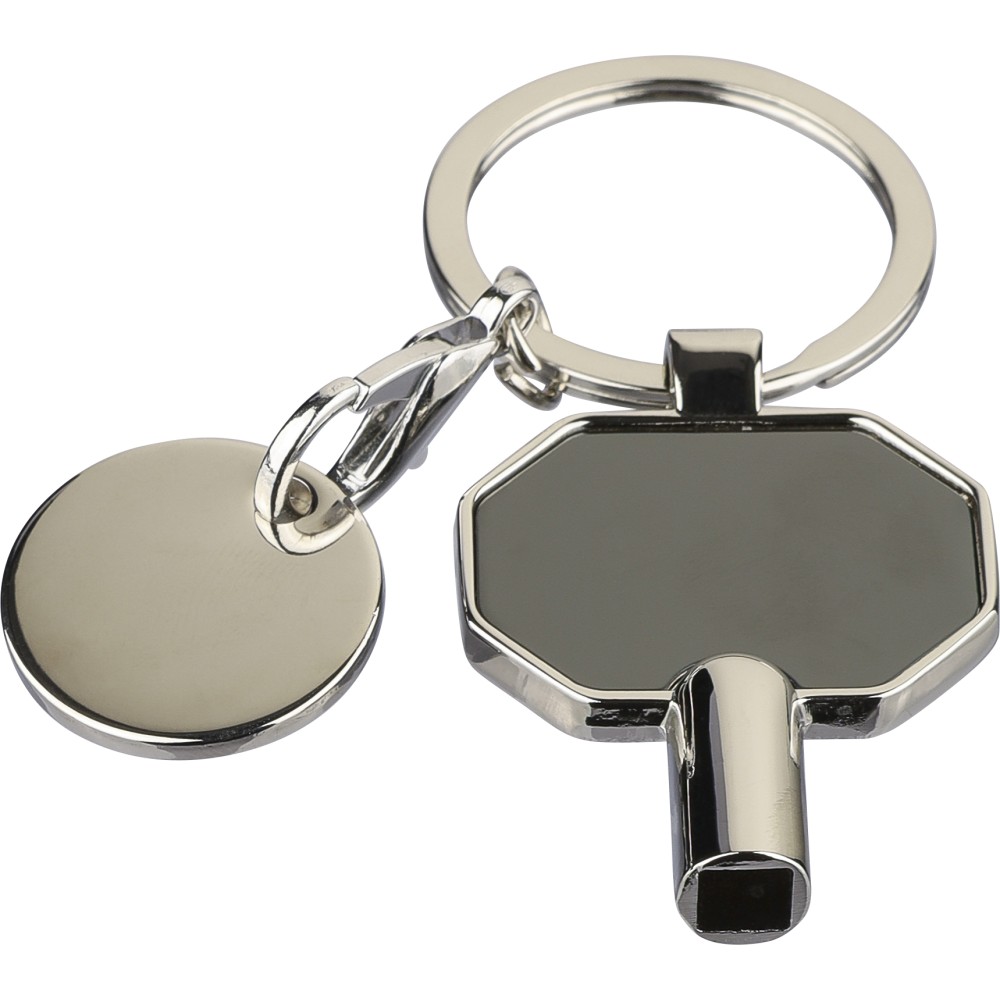 Újrahasznosított cinkötvözetből készült radiátor-légtelenítő kulcstartó bevásárlóérmével. 5×5 mm-es négyszögkulccsal rendelkezik, amely európai szabvány a radiátorok légtelenítéséhez. Erős fém kulcskarikával ellátva, a terméken recycled (újrahasznosított) alapanyagra utaló logó található. Illusztrációval ellátott barna karton borítékban csomagolva.