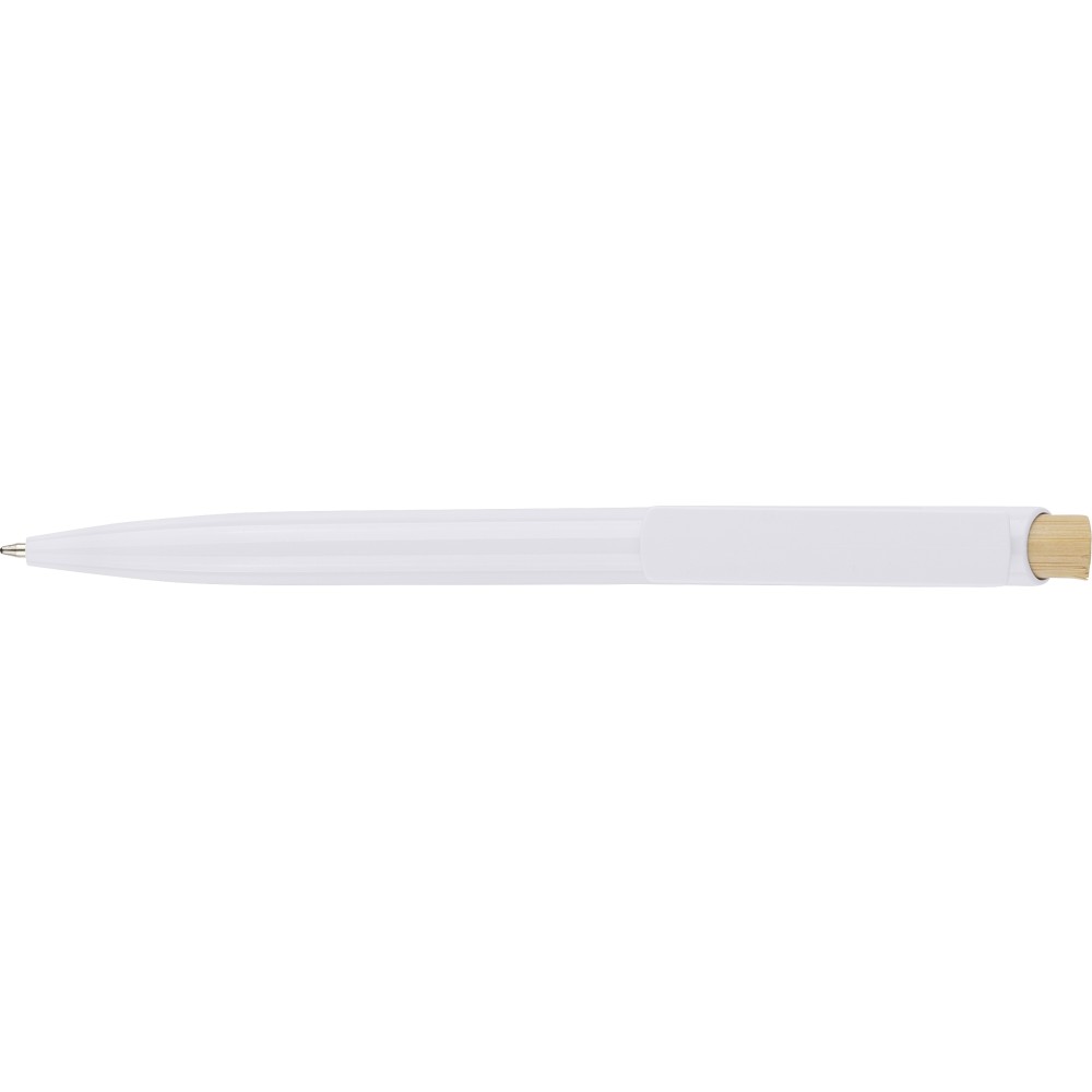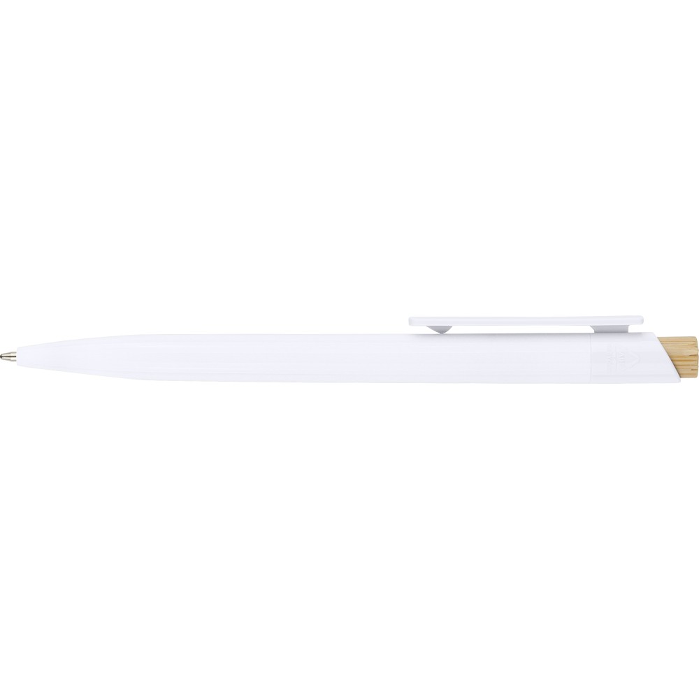 Újrahasznosított ABS-ből készült golyóstoll bambusz nyomógombbal és fehér klippel, digitális nyomtatásra alkalmas kivitelben. A tolltesten fröccsöntés során elhelyezett recycled (újrahasznosított) alapanyagra utaló logó található. Megközelítőleg 600 méter íráshosszúságú, kék színű tollbetéttel.