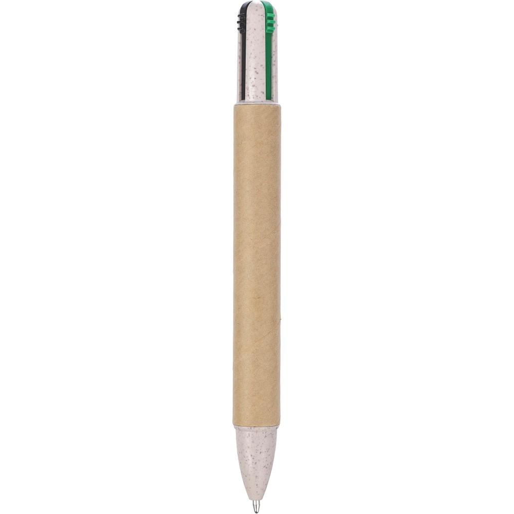 Újrahasznosított kartonból és szalmából készült négyszínű golyóstoll. Kb. 300 méter íráshossz színenként. Tollbetét színek: kék, fekete, piros és zöld.
