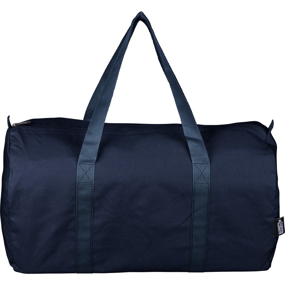 Újrahasznosított pamut-poliészter, 330 g/m2 kevertszövetből készült sporttáska nagy, cipzáras felső rekesszel, 100 cm hosszúságú és 3 cm szélességű hosszú fülekkel, a táska színével megegyező hevederrel. Megközelítőleg 30 literes űrtartalommal rendelkezik. A külső felületen rPET címkével, a belső részben újrahasznosított alapanyagra utaló címkével ellátva.