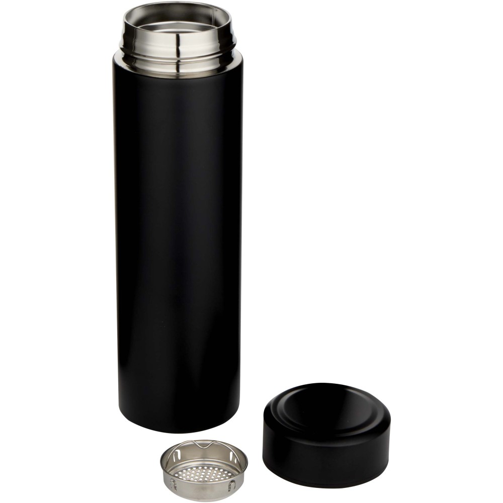 Duplafalú, vákuumszigetelt rozsdamentes acélból készült termosz, amely hosszú ideig tartja az italokat a kívánt hőmérsékleten. A kényelmesebb használat érdekében egy kivehető teaszűrőt tartalmaz. A 450 ml-es űrtartalom és a szivárgásmentes kialakítás révén ideális választás a mindennapi használatra vagy utazásokhoz.